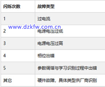 直到故障被用戶清除,紅色 LED常滅。故障類型對應的閃爍次數如下表: