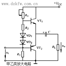 改進(jìn)后的電路稱為甲乙類放大電路,電路中的VD1、VD2、R1、R2、R3共同組成三極管的偏流電路,調(diào)節(jié)R1可以改變偏置電流大小。