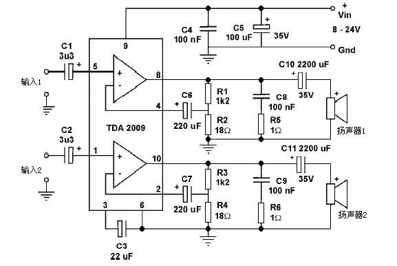 原理及制作要點: C1、C2為輸入電容,C10、C11為輸出電容。C6、C7為反饋電容。R1/R2或(R3/R4)控制反饋量。放大器的增益等于1+(R1/R2)=68或37dB。C4、C5為電源濾波電容。該裝置最大電源電壓為28V。工作時TDA2009A需加散熱片,并應注意電源線和接揚聲器接線的選擇。輸入端應選用屏蔽線并盡可能的短。焊接TDA200A時注意時間不要太長,動作要快,但要讓其充分與電路板融合。