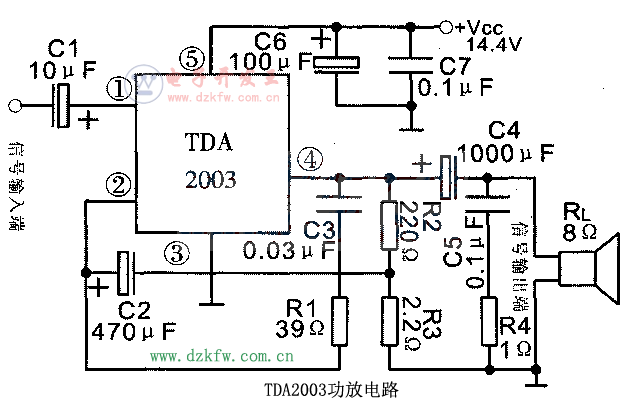 集成塊TDA20031個,1Ω、2.2Ω、39Ω、220Ω電阻各1個;0.03μF、0.03μF、100μF、470μF、1000μF電容各1個,0.1μF電容2個;揚(yáng)聲器8Ω、0.25W1個,14.4V電源一個。