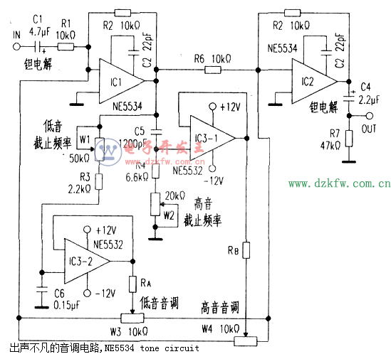 調節性能取決于電阻RA和RB的阻值,經我試驗,當RA=—RB-4.7kΩ時,調節性能為±l0dB,為了改變調節性能必須按比例增加RA和RB的阻值。