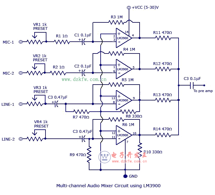 下面給出一個簡單的多聲道音頻混頻器電路采用LM3900四放大器。該電路由4個通道四通道放大器(LM3900)。兩個麥克風音頻輸入和兩個直接的線路輸入,可在這條賽道。通過加入與此相同的電路并聯,可以增加投入的數量,根據應用。每一個輸入連接到建在每節放大器的反相輸入端的LM3900.The分別放大每一個音頻輸入和輸入輸出端子。從每個通道的輸出端連接到一個單一的輸出線不超過680K的電阻,產生一個混合音頻輸出具有非常低的噪音。這種音頻混頻器電路,不使用低阻抗輸入混合的理想來源。電容C1到C4相應的渠道去耦電容。C5是輸出去耦電容。