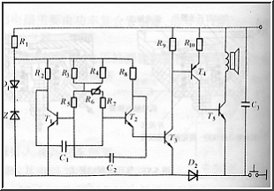 工作情況:電子喇叭發聲的基本原理是通過控制喇叭線圈的電流,使電磁吸力時有時無,從而控制膜片的前后運動實現發聲的。三極管T1、T2和T3構成一個多諧振蕩器,其工作電源由穩壓管提供。T4和T5作為功率放大器,控制喇叭線圈的電流。當振蕩器T2截止時,T3截止,T4和T5導通,喇叭線圈中有電流通過,產生電磁吸力吸動膜片。當振蕩器T2導通時,T3導通,T4和T5截止,喇叭線圈中無電流通過,膜片復位。