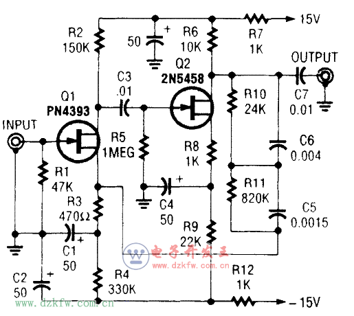磁感應(yīng)唱機(jī)放大器 此前置放大器是一個(gè)遠(yuǎn)程軸向通道,它用于磁電話墨盒的補(bǔ)償。