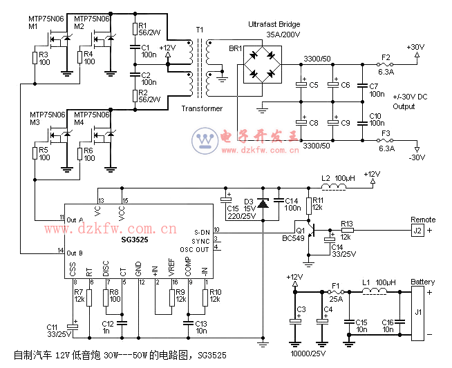 自制汽車12V低音炮30W---50W的電路圖,SG3525