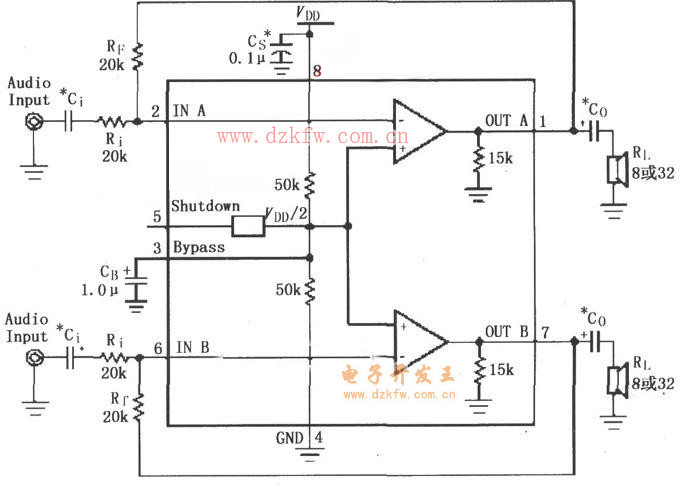 如圖所示為LM4880/4881用于雙聲道放大器的典型電路。左右聲道音頻信號分別輸入LM4880(SOP/MSOP封裝)的2、6腳,經(jīng)過內(nèi)部放大器放大后分別由1、7腳輸出,經(jīng)耦合電容Co加到各自聲道的揚聲器上。放大器增益由電阻Ri和RF決定,即Av=-RF/Ri。放大器的最大功耗為PDMAX=VDD2/2π2RL。輸入端輸出端外接電阻和電容分別決定輸入和輸出-3dB帶寬:Ci≥l/2π×20kΩ×20Hz,采用0.39μF(約);Co≥1/(2π×8Ω×20Hz),采用約1000μF。LM4880的5腳外接關斷控制,當5腳接VDD(高電平)時禁止工作;當5腳接地(低電平)時允許工作。