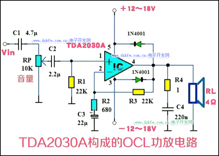 ▲ TDA2030A構(gòu)成的OCL功放電路。