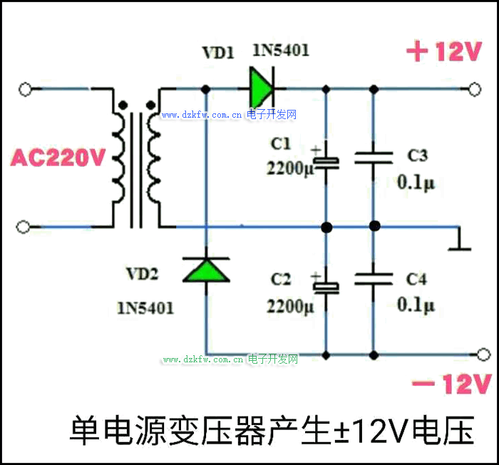 ▲ 單電源變壓器產(chǎn)生雙電壓的整流電路。