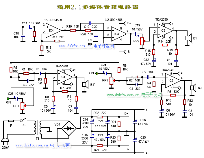 一、電源電路(圖紙的最下面部分):220V市電經過保險管(F 1A),和開關S后進入變壓器初級,變壓器的次級輸出 雙12V交流,雙12V送入由VD1組成的橋式整流電路電路,經過橋式整流和C14,C15(3300UF/25V)的濾波后, 輸出的空載電壓約為正負16V左右(2×12V),即A+為正16V,A-為負16V。正負16V為三塊功放芯片 TDA2030,UTC2030提供電源。另一路經過R21、R22的降壓后,由B+,B-輸出約正負12V為低音前置放大和低通濾波器IC4提供電源電壓。 在本圖紙當中,前置放大的供電并沒有采用78/7912三端穩壓電路,摩機愛好者在更換兩個3300uF電容時,也可以考慮 加入LM7812/7912為前置提供更為穩定的工作電壓。