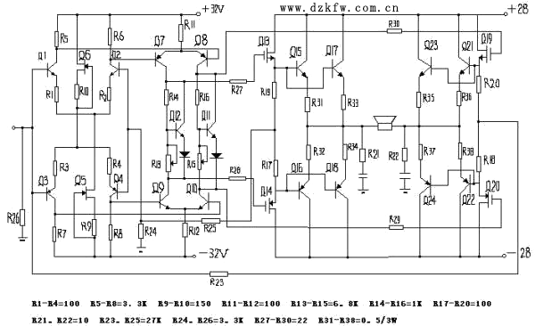 調(diào)校:因?yàn)楸竟Ψ湃恐瘪睿骷?jí)間相互影響,所以應(yīng)焊接調(diào)試同時(shí)進(jìn)行。輸入級(jí)焊好后調(diào)R5,R6:使R3,R4,R5,R6四只電阻上電壓為3V左右,每只電阻上的電壓必須相同,否則應(yīng)重新配對(duì)。然后焊入激勵(lì)級(jí)四只晶體管,重測(cè)輸入級(jí)工作點(diǎn)有無漂移,如有則重新配對(duì)激勵(lì)級(jí)。平衡后Q7-Q10的工作電流應(yīng)在 12MA左右。最后焊入功率管,調(diào)R8,R9為最小值,接通電源,如無異常即可調(diào)整R8 R9,使電流放大級(jí)每只晶體管電流為380MA工作一小時(shí)后再通調(diào)一次。