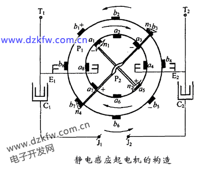 當bl,b5繼續轉到n4,n3處時,a1,a5正好轉到n3,n4處。由于靜電感應使b1,b5通過電刷n4,n3和導電桿分別帶上負電荷和正電荷。此后a1b1與a5,b5又分別轉向E2,E1,導致E2,E1上所帶的負電、正電繼續增加。