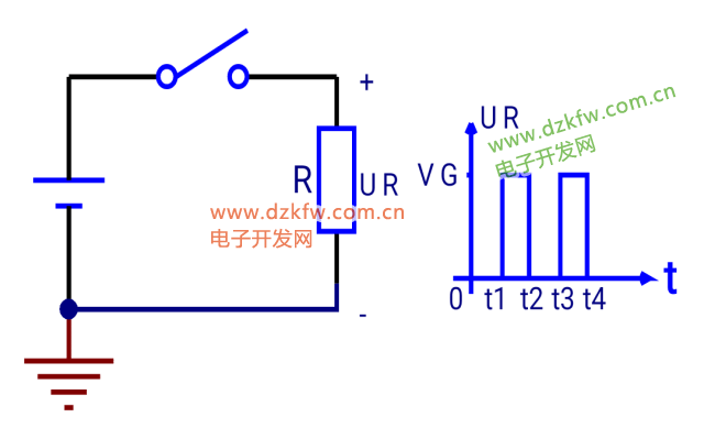 如圖所示為簡(jiǎn)單的脈沖發(fā)生器電路,設(shè)開關(guān)S原先(初始時(shí))是打開的,電阻兩端電壓UR=0。 若在t1時(shí)刻接通開關(guān)S,則電阻R兩端電壓將從0突然跳變到近于電源電壓VG,即UR=VG; 若在t2時(shí)刻,突然斷開開關(guān)S,則電阻R兩端電壓將從VG又突然跳變到0,即UR=0,同理不斷的通斷開關(guān)S,則R兩端的電壓就會(huì)如圖所示波形變化,這就是一串脈沖信號(hào)。