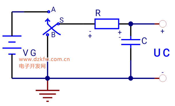 設(shè)初始時(shí),開關(guān)S閉合于B點(diǎn),電容C上沒有電荷,所以Uc=0,當(dāng)S由B合向A后,電源VG通過R向C充電,根據(jù)電容的基本特性電容器兩端的電壓不能突變,在充電開始瞬間,Uc=0(幾乎等于短路),此時(shí)充電電流最大。 因此ic=VGR,電阻R兩端的電壓UR也最大,UR=ic*R=VG。