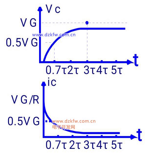R與C的乘積稱為電路的時(shí)間常數(shù)τ=RC,若R的單位為Ω,C的單位為F,則τ單位為S。 充電快慢可由時(shí)間常數(shù)τ來衡量,τ大則慢,τ小則快,一般當(dāng)充電時(shí)間t=0.7τ時(shí),Uc≈0.5VG,當(dāng)t=(3-5)τ,認(rèn)為充電結(jié)束。