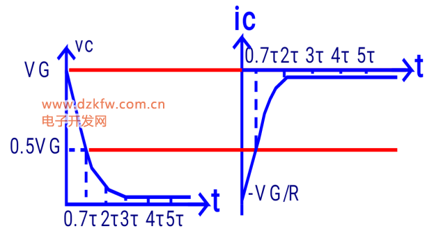隨著電容C上電荷的充電積累,Uc開始上升(UR下降),同時(shí)因?yàn)閁R=VG-Uc,ic=VRR=(VG-Vc)R,所以ic就下降,到最后,U=VG,ic≈0,此時(shí)充電過程結(jié)束。