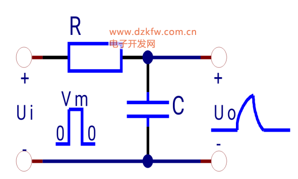 設(shè)輸入信號(hào)UI為矩形脈沖波,當(dāng)UI由0跳邊到Vm時(shí),相當(dāng)于電路的輸入端接了一個(gè)電源電壓Vm,電容C開始充電,Uc以指數(shù)規(guī)律上升。 由于Τrc>tp,所以電容C的充電過程緩慢,在t1-t2時(shí)刻內(nèi),Uc的上升只是指數(shù)函數(shù)曲線很小的一段。