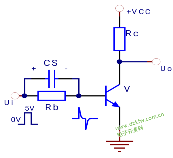 當(dāng)輸入信號(hào)為正跳變瞬間,CS相當(dāng)于短路,從而能夠提供一個(gè)很大的基極電流使三極管迅速進(jìn)入飽和狀態(tài),隨后電容CS充電,充滿后CS相當(dāng)于開路,基極電流與CS無關(guān)。