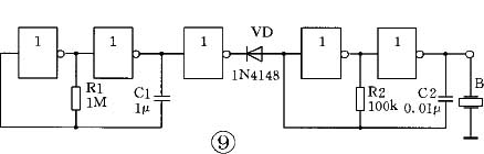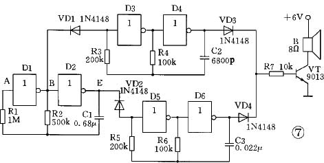 同學:現在我對由非門組成的多諧振蕩器的工作原理已經清楚了。在仿警笛發生器電路(圖7)里,三個多諧振蕩器的振蕩頻率我分別計算了一下,左邊的約為2Hz,右上邊的為1kHz,右下邊的約為330Hz,您看對嗎?