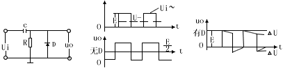 箝位的作用是使信號的起始電平固定在某個數值上,以圖二說明:當電路輸入一矩形波信號Ui。若無D時,Ui中的直流分量U被C隔開,只有交流分量傳至輸出端,使用輸出信號失去直流分量而改變了起始電平,用了箝位二極管D后,當Ui=E時,D截止,C充電,因時間常數RC很大,所以輸出Uo稍微下降了△U;當Ui突然變至零時,D導通;C經D很快放電,輸出從-△U很快趨于零,因此輸出信號被D箝位于零起始電平,也可以說,恢復了直流分量。
