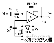 放大器電壓放大倍數Av僅由外接電阻Ri、Rf決定:Av=-Rf/Ri。負號表示輸出信號與輸入信號相位相反。按圖中所給數值,Av=-10。此電路輸入電阻為Ri。一般情況下先取Ri與信號源內阻相等,然后根據要求的放大倍數在選定Rf。Co和Ci為耦合電容。