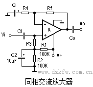 見附圖。同相交流放大器的特點是輸入阻抗高。其中的R1、R2組成1/2V+分壓電路,通過R3對運放進行偏置。