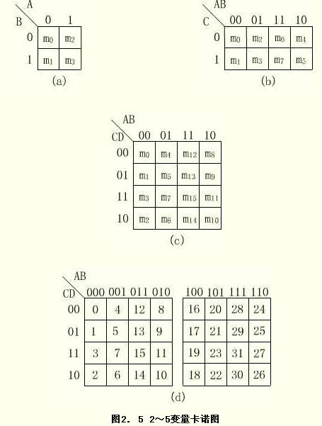 卡諾圖中最小項的排列方案不是唯一的,圖2.5(a)、(b)、(c)、(d)分別為2變量、3變量、4變量、5變量卡諾圖的一種排列方案。圖中,變量的坐標值0表示相應變量的反變量,1表示相應變量的原變量。各小方格依變量順序取坐標值,所得二進制數對應的十進制數即相應最小項的下標i。