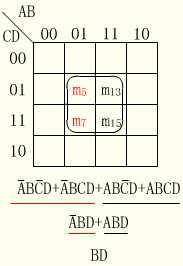 根據定理AB+AB=A和相鄰最小項的定義,兩個相鄰最小項可以合并為一個與項并消去一個變量。例如,4變量最小項ABCD和ABCD相鄰,可以合并為ABD;ABCD和ABCD相鄰,可以合并為ABD;而與項ABD和ABD又為相鄰與項,故按同樣道理可進一步將兩個相鄰與項合并為BD。