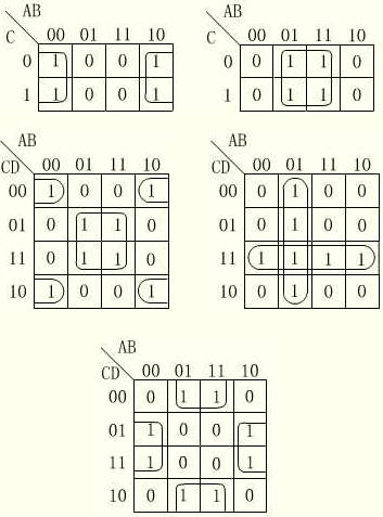 卡諾圖的一個重要特征是,它從圖形上直觀、清晰地反映了最小項的相鄰關系。當一個函數用卡諾圖表示后,究竟哪些最小項可以合并呢?下面以2、3、4變量卡諾圖為例予以說明。