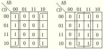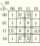 圖中,F的0方格即反函數F的1方格,它們代表F的各個最小項,將全部0方格合并就可得到反函數F的最簡“與-或”表達式