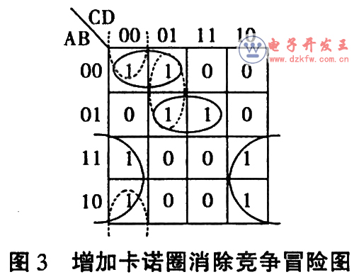 例如圖3所示的卡諾圖中,有兩處存在卡諾圈相切現(xiàn)象,故其表示的邏輯函數(shù)式F=ABC十ABD+AD存在冒險。可加兩個卡諾圈(虛線圈)破壞其相切性,也即增加兩個冗余項BCD和ACD,消除競爭冒險后,該邏輯函數(shù)的表達(dá)式如下所示: