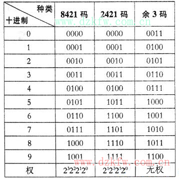 二一十進(jìn)制代碼:用4位二進(jìn)制數(shù)b3b2b1b0來表示十進(jìn)制數(shù)中的0~9十個(gè)數(shù)碼,簡稱BCD碼,幾種常見的BCD碼見下表。
