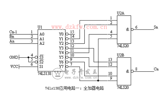 全加器有3個(gè)輸入端:a,b,ci;有2個(gè)輸出端:s,co.與3-8譯碼器比較,3-8譯碼器有3個(gè)數(shù)據(jù)輸入端:A,B,C;3個(gè)使能端;8個(gè)輸出端,OUT(0-7)。這里可以把3-8譯碼器的3個(gè)數(shù)據(jù)輸入端當(dāng)做全加器的3個(gè)輸入端,即3-8譯碼器的輸入A、B、C分別對(duì)應(yīng)全加器的輸入a,b,ci;將3-8譯碼器的3個(gè)使能端都置為有效電平,保持正常工作;這里關(guān)鍵的就是處理3-8譯碼的8個(gè)輸出端與全加器的2個(gè)輸出的關(guān)系。