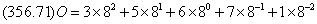 有0,1,…,6,7等八個數碼元素,基數r=8,逢八進一,如:(356.71)8或(356.71)O,寫成通式展開后為:。 高位至低的權值為:
