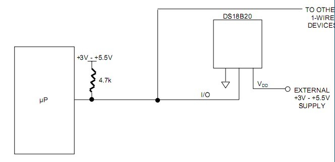 另外一種提供電流的方式是通過使用VDD引腳連接一個外部電源,如下圖所示,這樣連接的優勢是DQ上不需要連接一個強上拉,并且總線控制主機不需要在溫度轉換的時候總保持高電平,這樣使得在轉換的時間內單線上可以有其他的數據通過。此外,任何DS18B20的序列都可以掛在單線上,如果都需要使用外部電源,可以同時通過執行“跳過ROM”和執行溫度轉換命令來進行溫度轉換,注意當外部電源激活時,GND必須接地。
