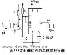 下面就時基555集成塊構成的單穩態觸發器來述一下其簡單工作原理。 所謂單穩態觸發器它只有一個穩定狀態,一個暫穩態。它在電路外加脈沖信號的作用下,可以從一個穩態轉換到另一個暫穩態狀態。在電路中由RC延時充放電的作用,該暫穩態保持一段時間后又回到原來的初始狀態,暫穩態維持時間由RC的阻值和電容量來決定。