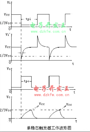 3、返回恢復階段: 當C充電使Vc值高于正向閥值(2/3Vcc)時,由于Vi'端負向尖脈沖已消失 ,Vi'值高于負向閥值(1/3Vcc),定時器翻轉為0,輸出低電平,集電極輸出端(7腳)對地導通,暫態階段結束。C通過7腳放電,使Vc值低于正向閥值(2/3Vcc),使單穩態觸發器恢復穩態。