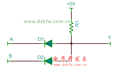 用兩個二極管組成的與門,A和B都為高電平時,Y才為高電平。