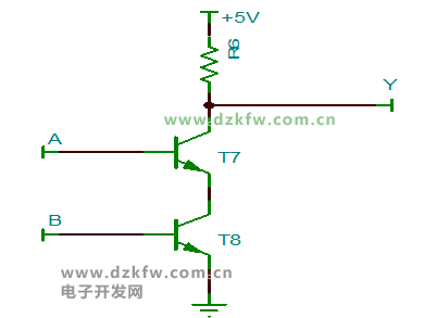 在二極管或門基礎上,可以加一個NPN三極管,也可以組成或門,A和B只要有一個高電平,T5就會導通,Y會由低電平變為高電平;當A和B都為低電平時,T5才截止,Y為低電平。