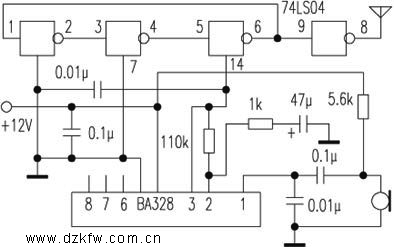 74LS04是一塊TTL集成電路,內(nèi)有六個(gè)單端輸入的與非門。筆者用其中三個(gè)與非門做成一個(gè)振蕩器。當(dāng)電源電壓為5V時(shí)其振蕩頻率約為90MHz,電源電壓降低時(shí)頻率降低;電源電壓升高時(shí)頻率也升高。當(dāng)然其振蕩幅度亦會(huì)隨之改變,但影響不大。這樣,筆者使用改變電源電壓的辦法來改變頻率(即達(dá)到調(diào)頻)。具體做法是用一塊音頻放大集成電路BA328的輸出,作為它的供電電源。