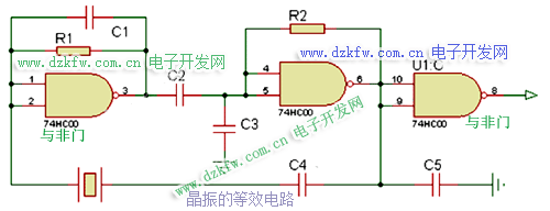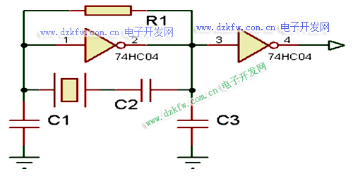 晶振基頻頻率一般于1.8~25MHz,工作于基頻的晶振一般與數字門電路組成振蕩器,電路比較簡單: