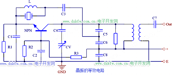 晶振五次泛音頻率一般在80~150MHz范圍,頻率更高,工作于五次泛音的電路常使用共基極的晶體管振蕩器: