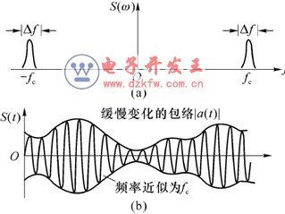 窄帶隨機過程的定義借助于它的功率譜密度的圖形來說明。圖3.5.1(a)中,波形的中心頻率為,帶寬為,當滿足時,就可認為滿足窄帶條件。