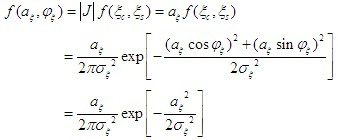 現在來確定窄帶平穩高斯過程的包絡和相位的統計特性,隨機包絡和隨機相位可表示為   利用概率論中隨機變量變換的關系來求解的概率密度函數,把,在某一時刻的隨機變量用,,來表示。根據隨機變量變換關系有   其中,,的聯合概率密度函數;