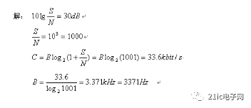 例2:已知僅存在加性高斯白噪聲的信道容量為33.6Kbit/s,其信號噪聲功率比為30db,求此模擬信道的帶寬為多少?