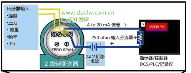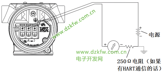 回到我們那個(gè)藍(lán)色的變送器,它是需要供電才能運(yùn)作的,那么怎么傳這個(gè)電力呢。我們曾經(jīng)說過4-20mA電流代表著每秒傳輸多少個(gè)電荷,這個(gè)電荷可以為變送器帶來電力。可是現(xiàn)代電子器件大多是工作在一個(gè)電壓范圍里面,比如家用電器需要在220V交流電壓下工作,比如我們的U盤是在5V直流電壓下工作。怎么把4-20mA電流變成電壓?加一個(gè)電阻就好了。查閱羅斯蒙特3051變送器的手冊可以發(fā)現(xiàn),它的正常工作電壓是直流10.5-42.4V。根據(jù)歐姆定律可以算出,這個(gè)變送器可以看成是可變電阻,電阻最大時(shí)是42.4V/4mA=10kΩ,電阻最小時(shí)是10.5V/20mA=525Ω。之所以有這么寬的變化范圍是因?yàn)橐环矫嫒绻狧ART通信,需要串聯(lián)一個(gè)250歐姆電阻,參考下面的接線圖。
