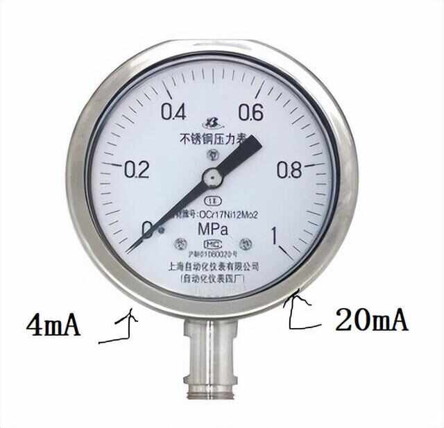再看一眼這個(gè)壓力表,如果我們事先約定,當(dāng)壓力為0MPa的時(shí)候就輸出4mA,1MPa的時(shí)候輸出20mA,那么那個(gè)蹲在中控室拿著電流表看電流的人就會(huì)知道,他手上表顯示12mA代表現(xiàn)場管道里面的壓力是0.5Mpa。如果電流一直不變,代表壓力一直是這么大,電流有變化,可以得知管道壓力也在變化,電流和壓力是線性關(guān)系,知其一就知道其二。
