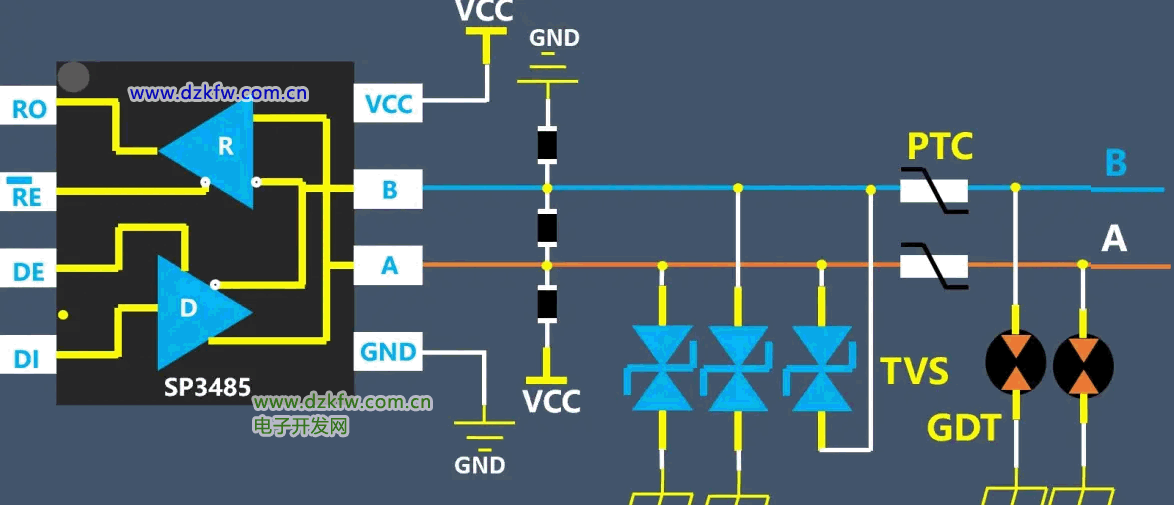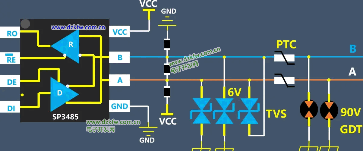 非隔離的485信號典型的防護電路就是這個,防護器件包括氣體放電管,PTC自恢復保險絲,TVS管等。