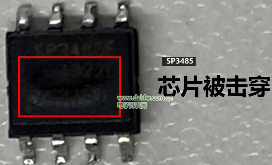 仔細觀察測試浪涌后損壞的485收發器芯片發現,外觀損壞程度并不是太大,沒有出現大面積的損壞,初步估計是浪涌經過防護器件后還是會有比較大的殘壓進入到485收發器芯片,從而導致收發器芯片過壓損壞。