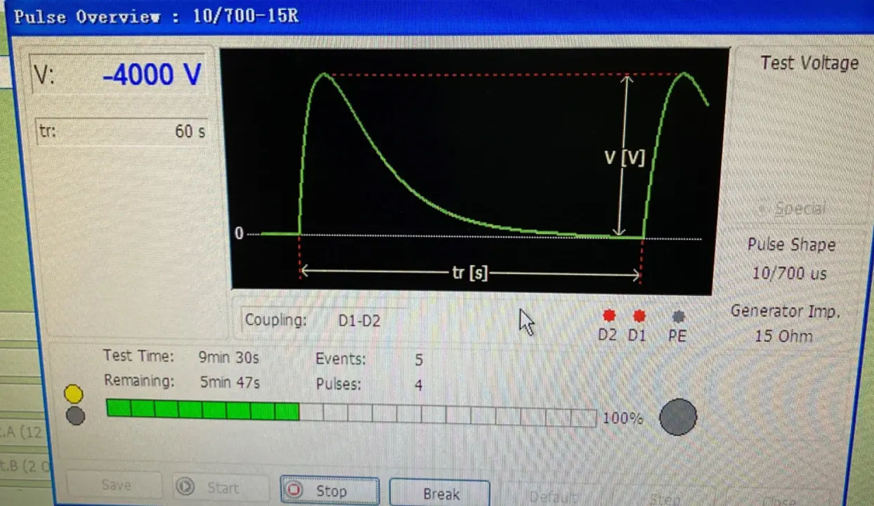 浪涌測試采用10/700的波形,測試電壓為正負4KV。