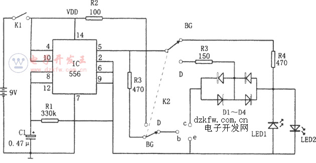 多諧振蕩器由l/2 556和R1、C1等組成,其振蕩頻率為f=1.44/R1C1。單穩態觸發器由另一半556構成,使556的兩個輸出端⑤腳和⑨腳輸出一對極性相反的峰值電壓為9V的5Hz的交替方波測試信號。